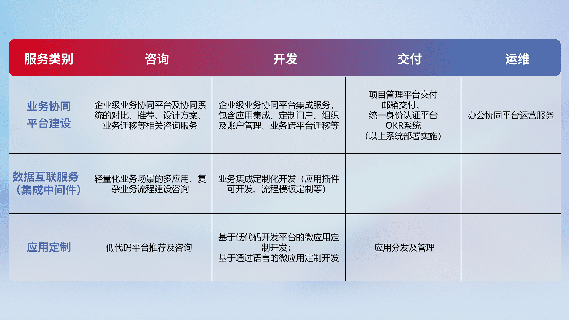 针对钉钉、、企微、、、IDaas等平台级产品提供产品的规划、、、方案、、、、交付、、、、定制化开发等服务,,实现如统一协同办公、、、、智能客户服务、、、、混合会议管理、、、、智能数据查询、、、、等业务场景,,,实现数字化转型。。
